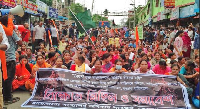 খাসখবর বিভাগীয় ডেস্ক: সরকার পতনের জেরে দেশের হিন্দু সম্প্রদায়ের ওপর হামলা, ভাঙচুর, অগ্নিসংযোগ ও লুটপাটের অভিযোগে জেলায় জেলায় বিক্ষোভ মিছিল ও প্রতিবাদ সমাবেশ হয়েছে। খুলনা, কুড়িগ্রাম, নীলফামারী জেলায় বিক্ষোভ সমাবেশ ও প্রতিবাদ মিছিল হয়েছে।