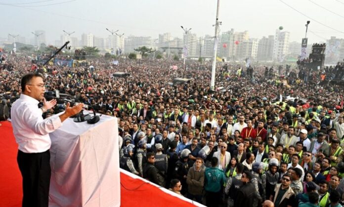 জিয়াপুত্র বলেন, ‘কয়েকদিন আগে এই বাংলাদেশের ’২৪-এর আন্দোলনের এক সাহসী সন্তান ওসমান হাদিকে হত্যা করা হয়েছে। ওসমান হাদি শহিদ হয়েছে। ওসমান হাদি এই দেশের মানুষের গণতান্ত্রিক অধিকার প্রতিষ্ঠা করতে চেয়েছিলেন। তিনি চেয়েছিলেন, দেশের মানুষ তাদের গণতান্ত্রিক এবং অর্থনৈতিক অধিকার ফিরে পাক। আজ ২৪ এর আন্দোলনে যারা শহিদ হয়েছেন, ৭১-এ যারা শহিদ হয়েছেন, বিগত স্বৈরাচারের সময় বিভিন্নভাবে গুম খুনের শিকার হয়েছেন। এই মানুষগুলোর রক্তের ঋণ যদি শোধ করতে হয়, আসুন আমরা আমাদের সেই প্রত্যাশিত বাংলাদেশ গড়ে তুলব। যেখানে আমরা সকলে মিলে কাজ করব। সবাই মিলে আমাদের প্রত্যাশিত বাংলাদেশ গড়ে তুলব।’