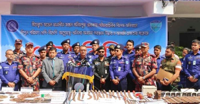 খাসখবর চট্টগ্রাম ডেস্ক: চট্টগ্রামের সীতাকুণ্ড উপজেলার জঙ্গল সলিমপুরের দুর্গম পাহাড়ি এলাকায় পরিচালিত যৌথ অভিযানে বিপুল পরিমাণ অস্ত্র, গোলাবারুদ ও বিস্ফোরক উদ্ধার করেছে আইনশৃঙ্খলা বাহিনী। অভিযানের সময় সন্ত্রাসীদের স্থাপন করা আইনশৃঙ্খলা বাহিনীর গতিবিধি পর্যবেক্ষণের সিসিটিভি ক্যামেরা ও নজরদারি টাওয়ারও ধ্বংস করা হয়েছে।